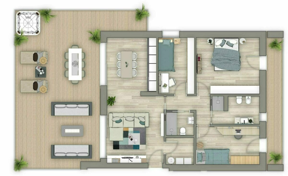 Locali: Soggiorno-cucina, 3 camere, 2 bagni, vano tecnico, terrazze